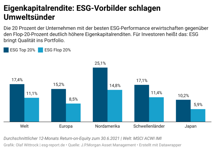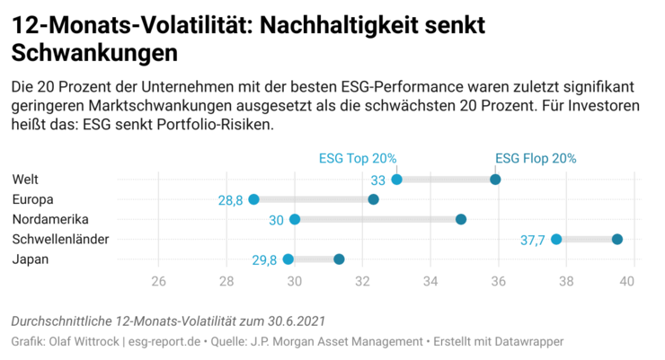 Neue Daten von J.P. Morgan Asset Management zeigen, dass Unternehmen, die sich stark an ESG-Kriterien orientieren, signifikant besser durch die vergangenen Monate gekommen sind. Gemessen an den durchschnittlichen Eigenkapitalrenditen und den mittleren Marktschwankungen haben sie das schwächste Fünftel, also die ESG-Sünder-Aktien, deutlich hinter sich gelassen. Und zwar weltweit. Wenn das keine harten Vertriebsargumente sind: