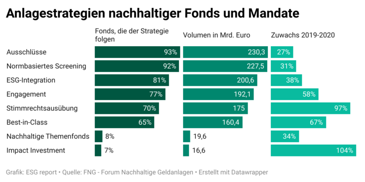 Auch wenn Ausschlüsse nach wie vor das Mittel der Wahl sind, um einen Fonds als nachhaltig zu titulieren, liegt die Wachstumsrate dieser Strategie mit 27 Prozent hinter dem Gesamtwachstum aller nachhaltigen Fonds von 35 Prozent. Dahingegen verzeichnen Impact Investments, also Investitionen mit einem klar messbaren ESG-Anlageziel, und die Ausübung von Stimmrechten bei Aktionärsversammlungen einen deutlich positiveren Trend.