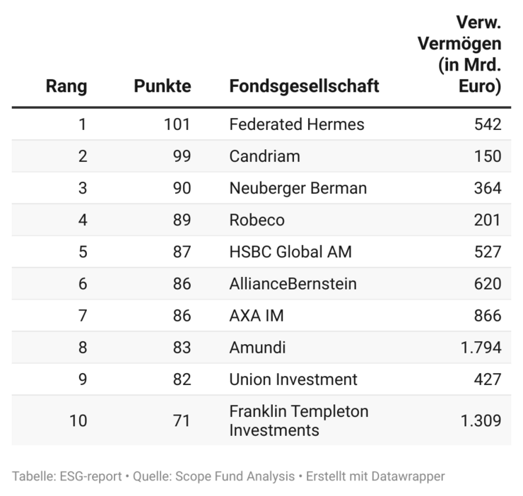 Aufgrund dieser Datenlage hat Scope eine Rangliste erstellt. Das Ergebnis: Keinem der Anbieter gelingt eine makellose ESG-Integration. Einige von ihnen befinden sich allerdings auf dem richtigen Weg. Allen voran: Federated Hermes (vormals: Federated Investors). Die US-Gesellschaft erreicht unter allen analysierten Fondshäusern als einzige ein dreistelliges Ergebnis. Dennoch liegt sie 15 Punkte unter dem Maximum. Womöglich waren die ESG-Anforderungen aber auch zu hoch angesetzt, wie die Analysten selbstkritisch bemerken.