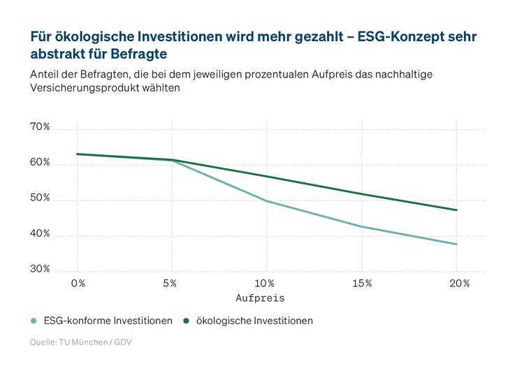 Ergebnis: Es kommt vor allem auf die Wortwahl an. Die Studie, die der GDV bei der Technischen Universität München (TUM) in Auftrag gegeben hat, zeigt, wie kaufentscheidend die passenden Begriffe sein können. So kaufen Kunden und Kundinnen eher Anlageprodukte, die Sie als "ökologisch" bezeichnen. Der von der EU-Taxonomie vorgeschriebene Begriff "ESG-konform" löst einen viel geringeren Impuls aus. Auch wenn es sich um ein und dasselbe Produkt handelt.