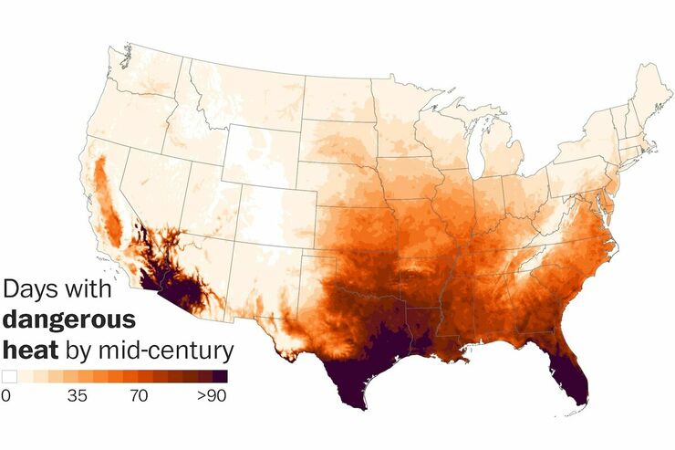 Nicht nur bei uns in Europa wird es immer heißer und trockener. Auch die USA müssen sich auf noch größere Hitzewellen einstellen. Ein beeindruckendes Dossier der Washington Post zeigt: In 30 Jahren drohen in vielen Gegenden jährlich 70 Tage über 100 Grad Fahrenheit – das entspricht rund 38 Grad. Die Welt fiebert.